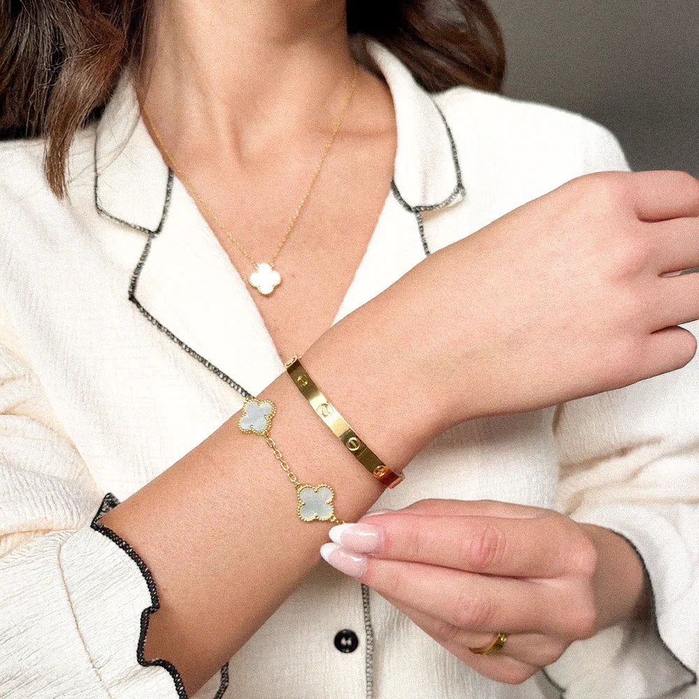 Dieses bezaubernde Set aus Halskette, Armband und Ohrringen vereint zeitlose Eleganz mit modernem Touch. Das ikonische schwarze vierblättrige Kleeblatt, eingerahmt von edlem Gold, strahlt subtilen Luxus aus – perfekt für den Alltag oder als stilvoller Abschluss eines eleganten Abends.